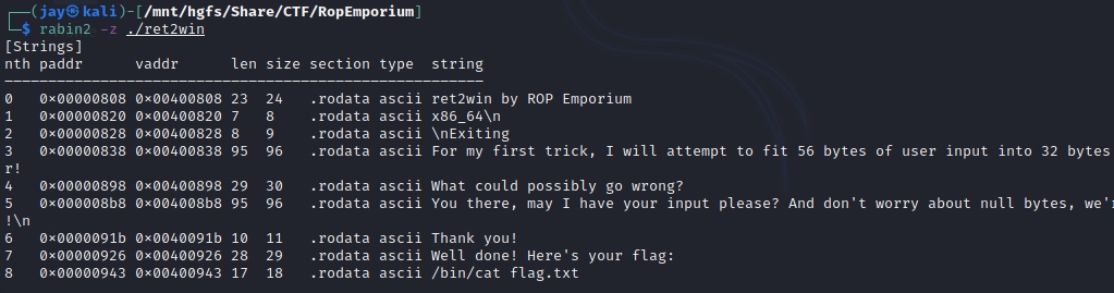 Within the binary there are a few functions, including one called ret2win at address 0x0000000000400756. This function contains a mov edi,0x400943 instruction, then a call 400560 <system@plt>, lets see what string is being moved into the EDI register from address 0x400983 - Rabin2 is great for analysing strings in binaries.